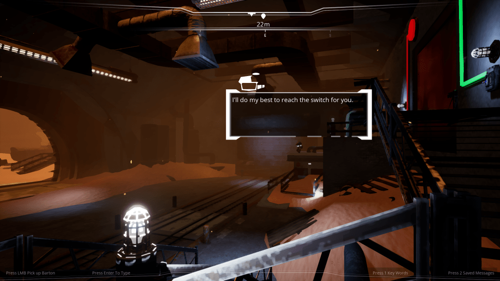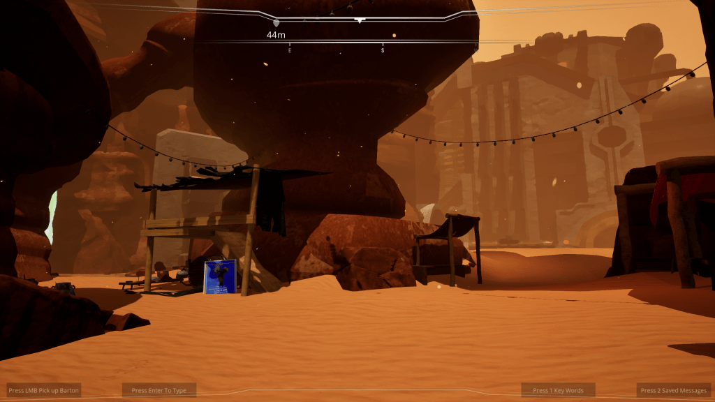Barton’s open dialogue functionality is driven from a Large Language Learning Model (Chat GTP 4o mini). Through player input and prompts, you and Barton can discuss anything, and build a connection together. What kind of relationship will you develop, while seeking to escape this desolate desert planet?