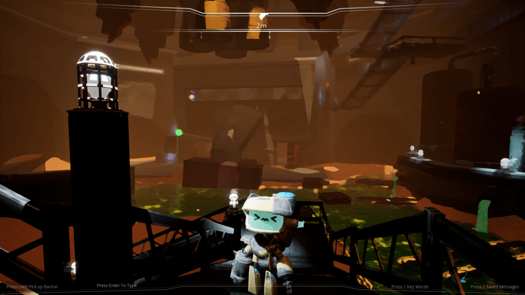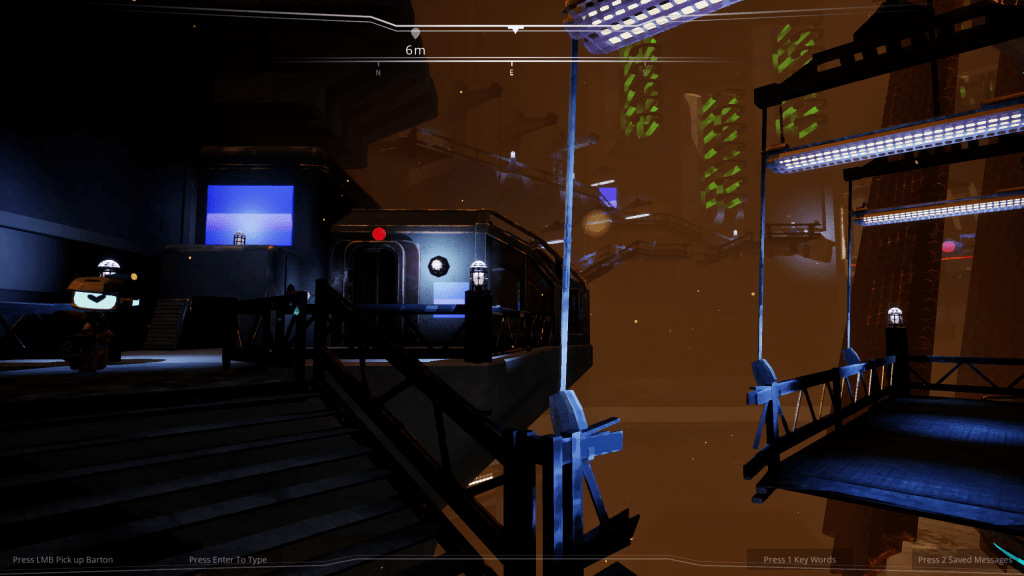 A sci-fi themed puzzle adventure, where the player has an open dialogue with a companion bot named Barton.